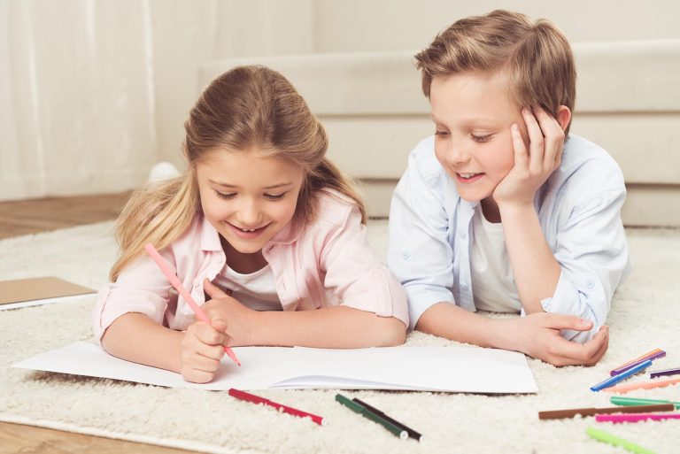 adorable pre-adolescent kids drawing pictures while lying on the floor at home