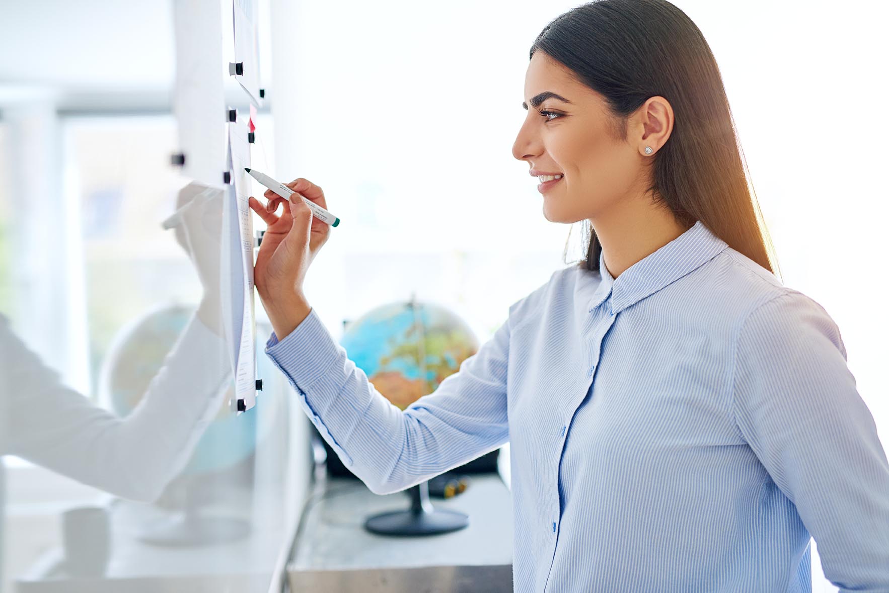 Side view on beautiful Arab female teacher with long hair and confident expression writing on white board