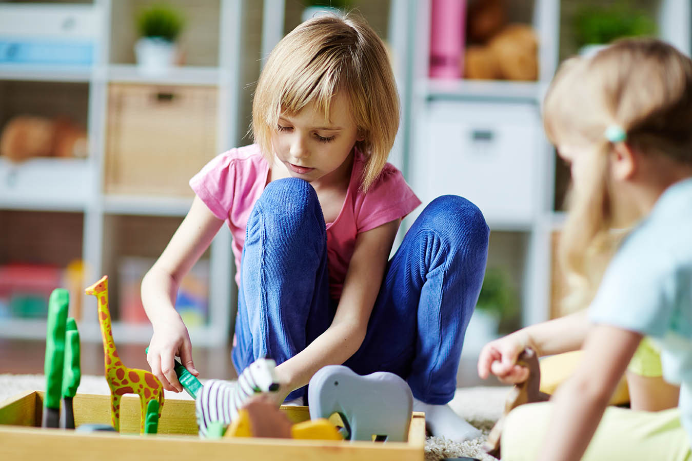 Cute girl and her friend playing zoo